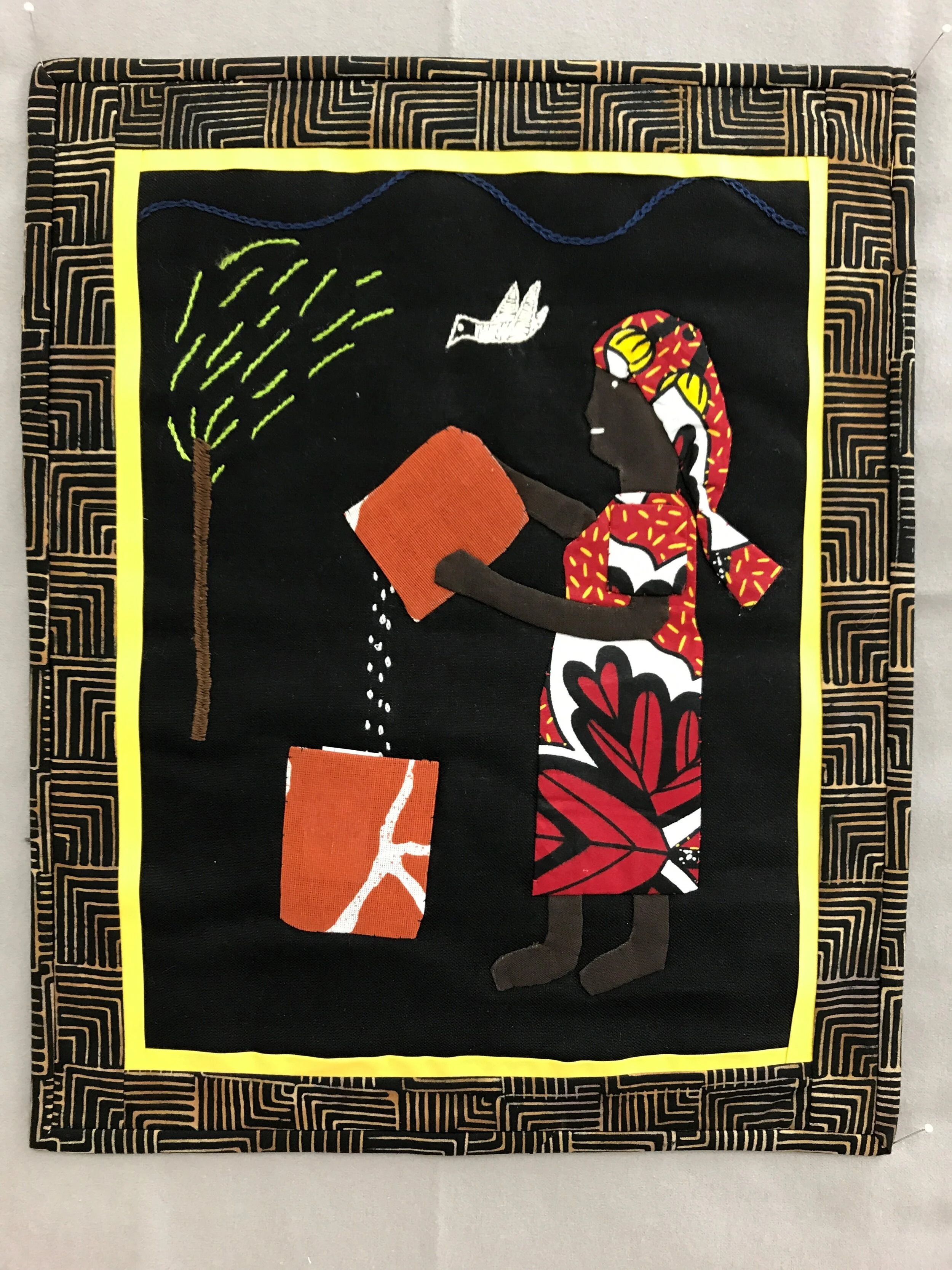 It dawned on Mary Ann that these art quilts were similar to the famous quilts of Gees Bend in that all the ideas and images came from the women’s own lived experiences. No one had ever taught them how a tree, chicken, woman, or hut should look. They stitched what they knew.